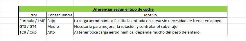 En coches con poca carga aerodinámica (GT3, GT4, TCR, Cup, etc.), dominar esta técnica puede suponer una gran diferencia en los tiempos de vuelta.